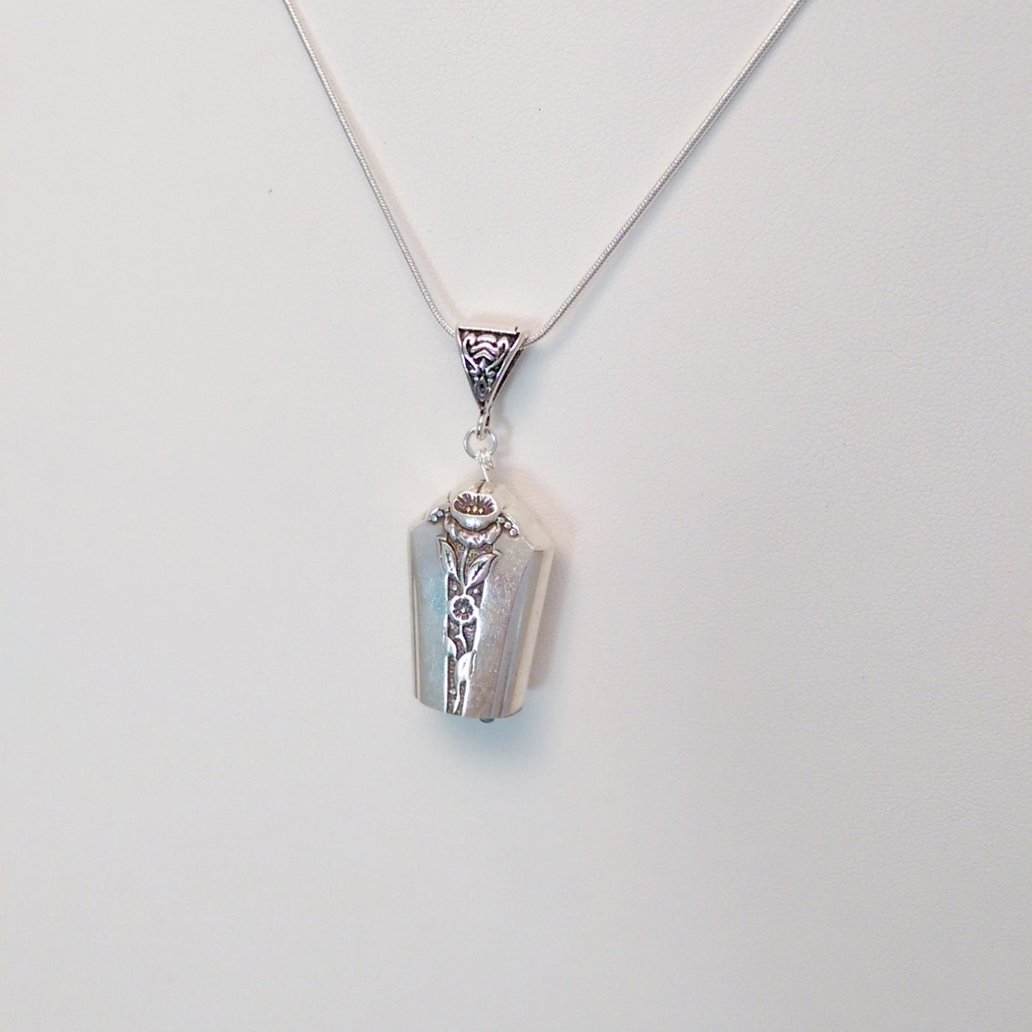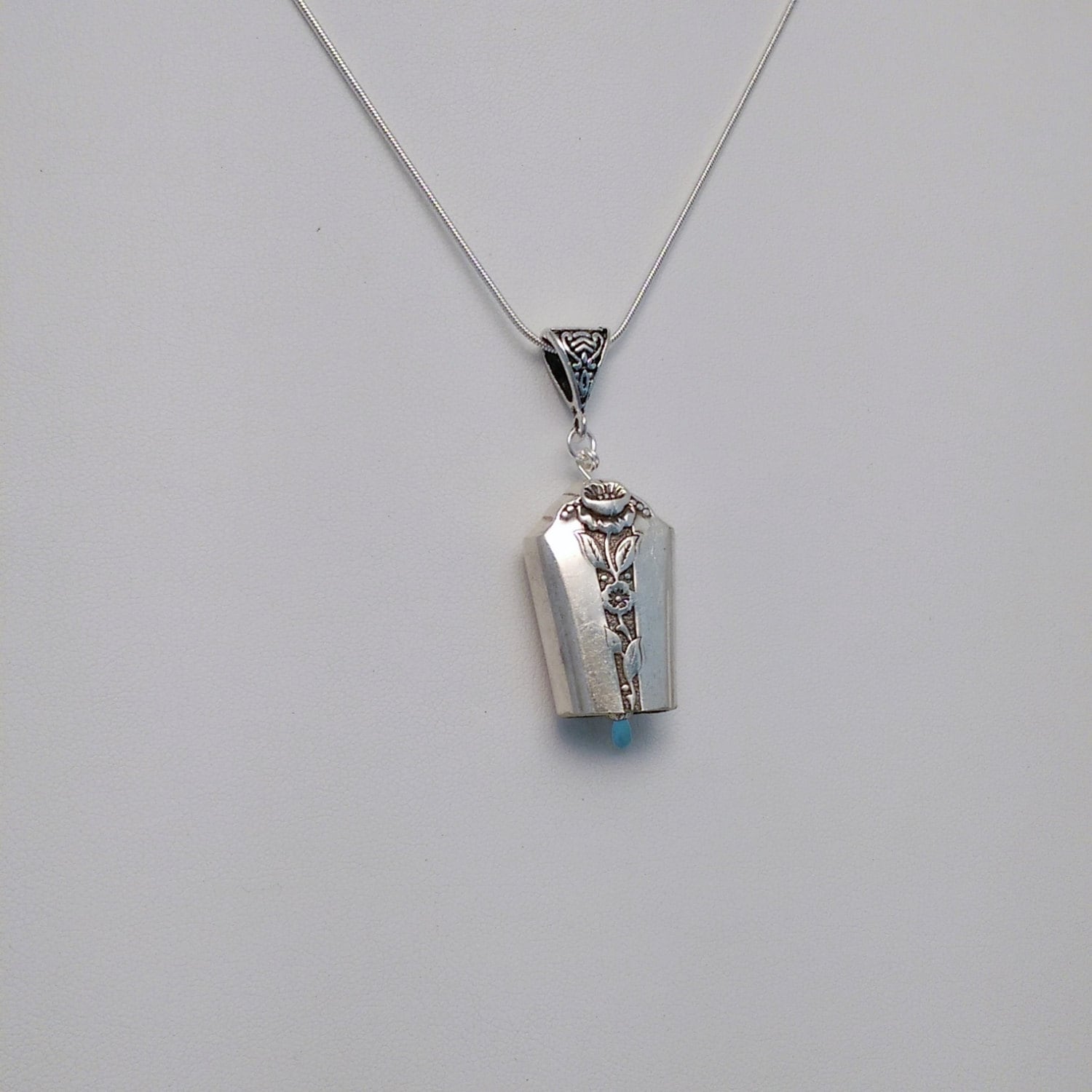 Spring Garden pattern 1949. recycled silverware. All components individually measured and cut to assure a pleasant ringing sound. Chain is 24" stainless steel. It can easily slide off chain and be worn on your own shorter chain or cotton cording. Very versatile.
