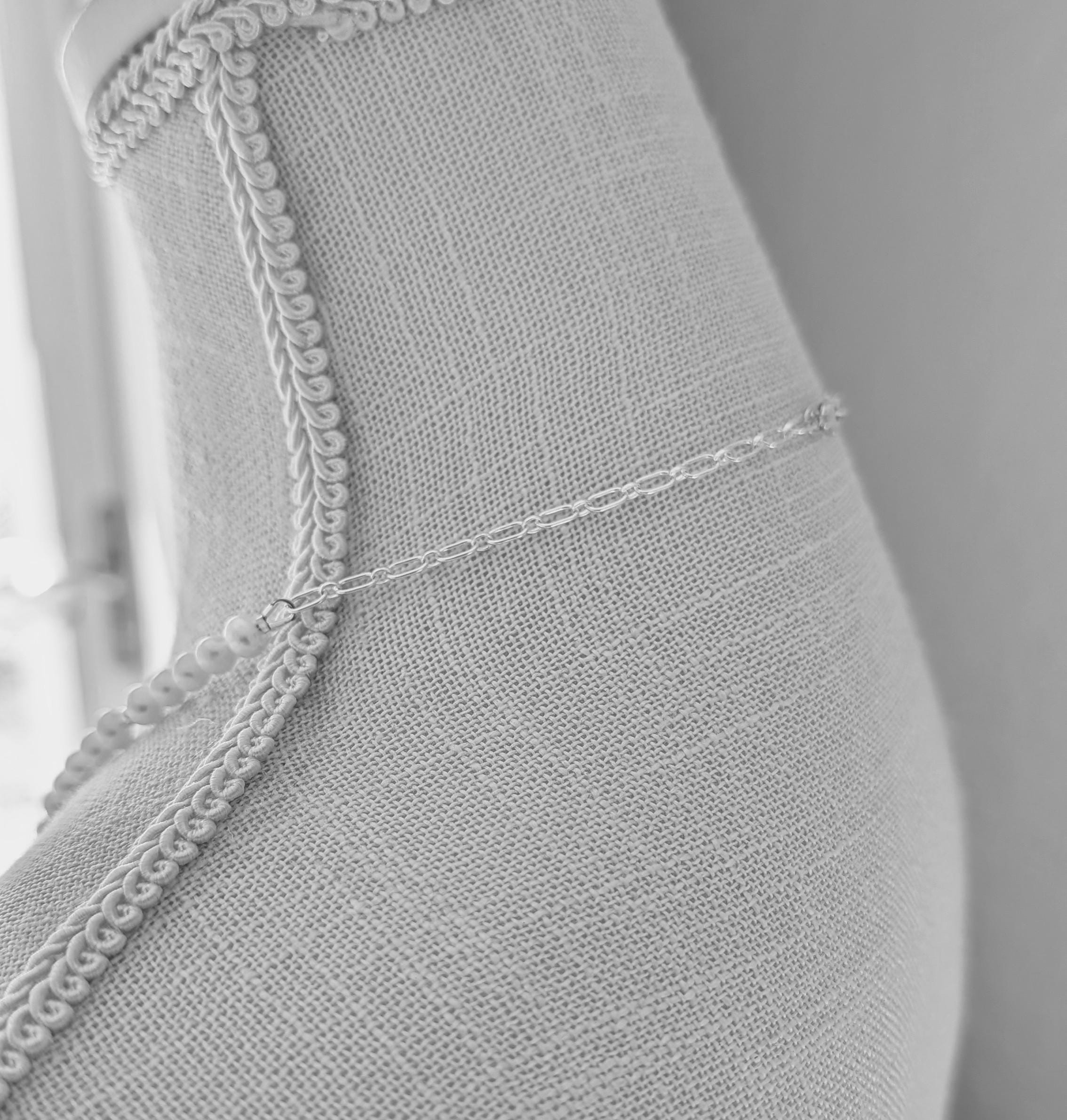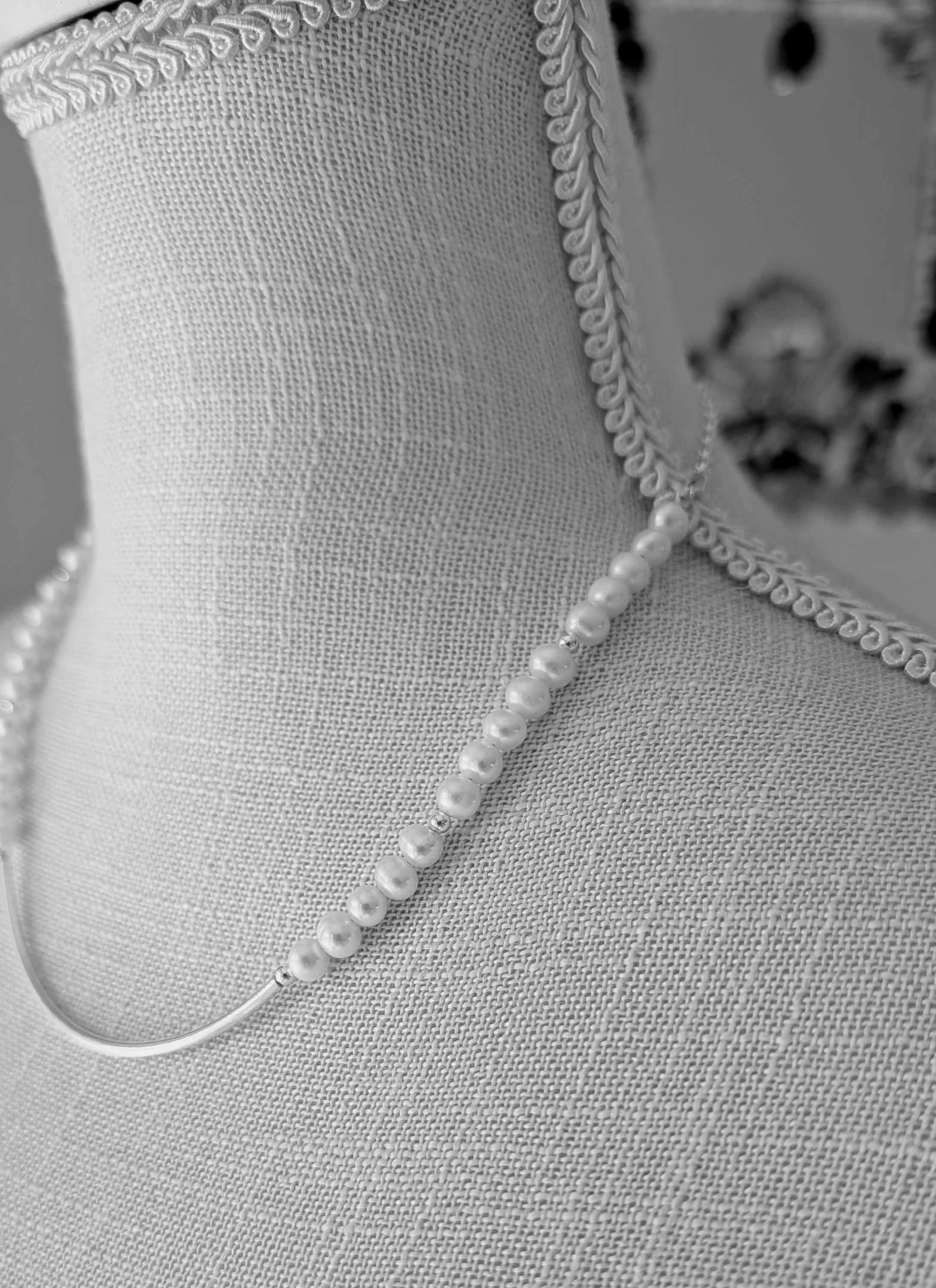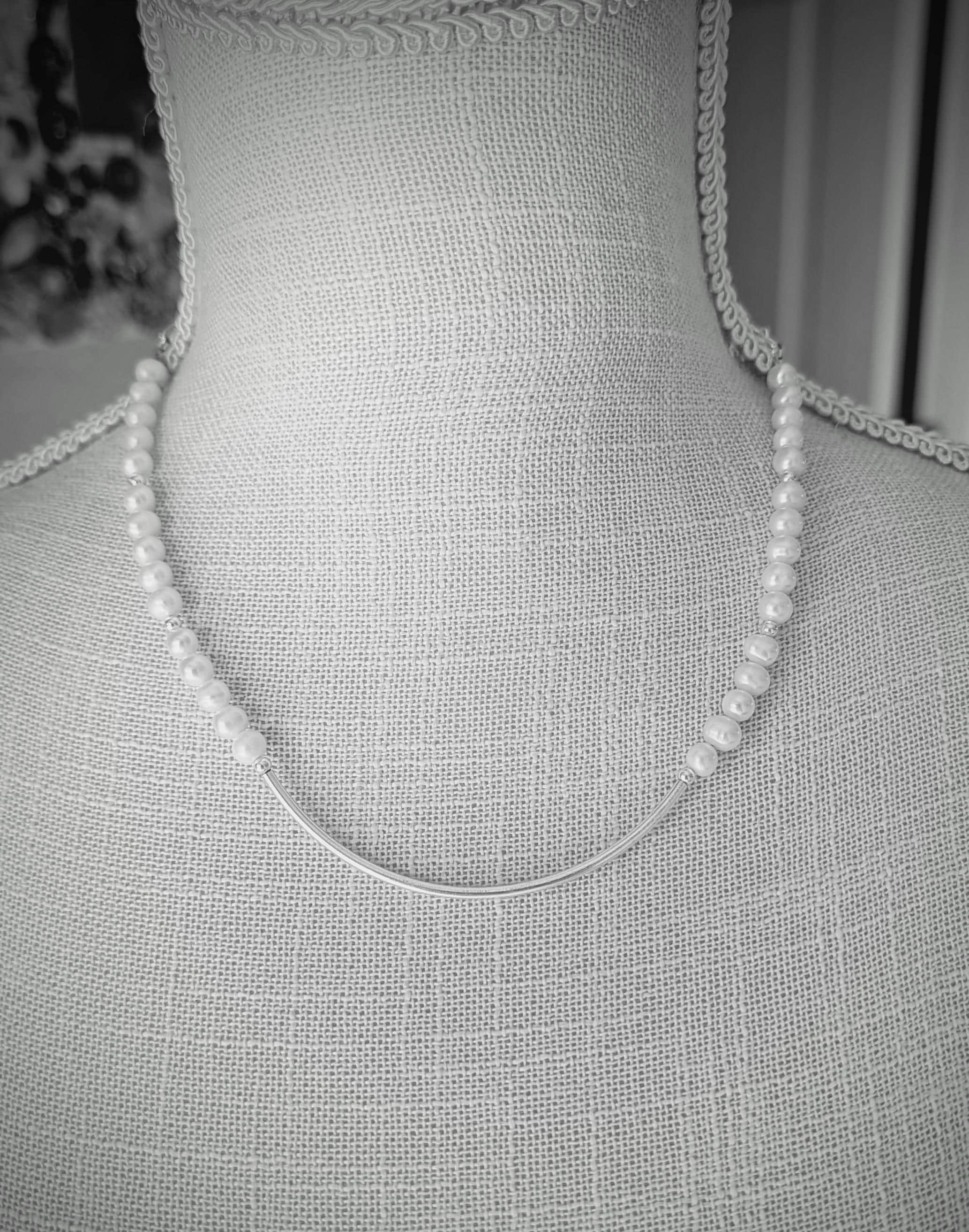 Freshwater pearls with sterling curved center focal. Elegant and simple! Very comfortable and lightweight.