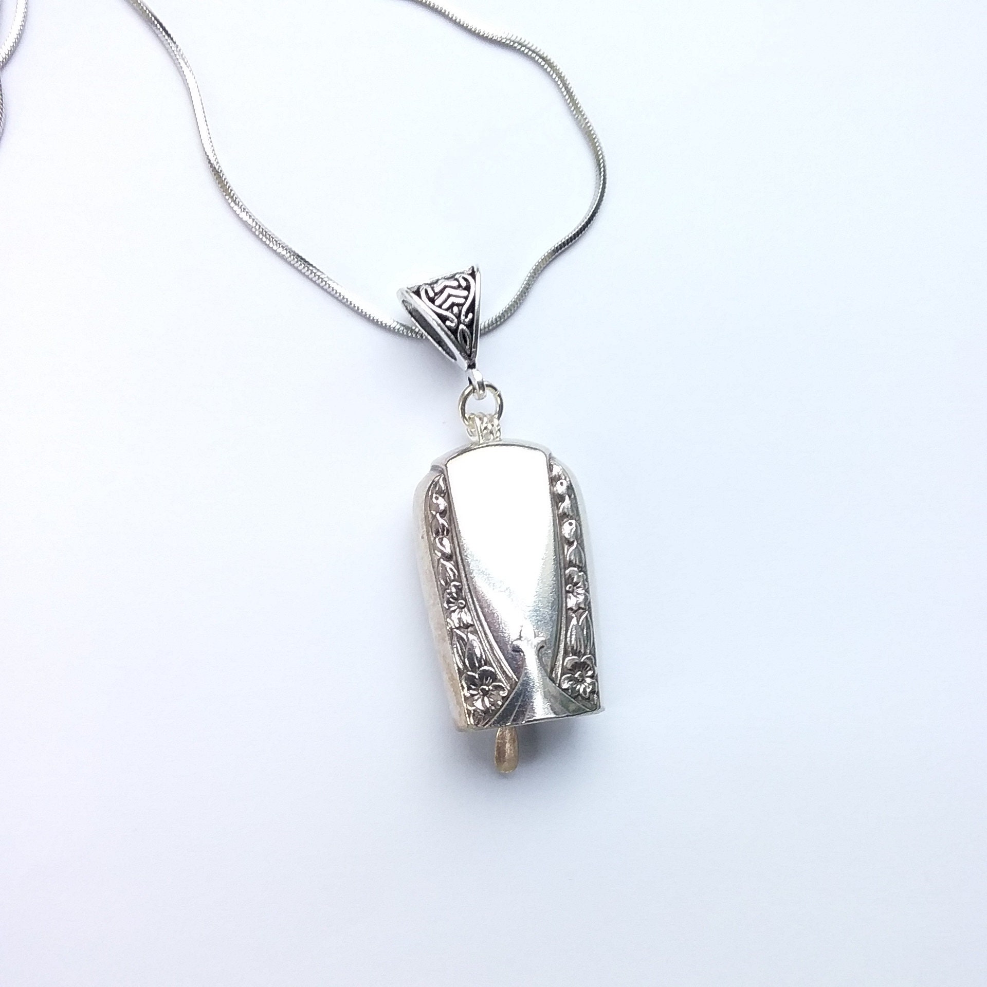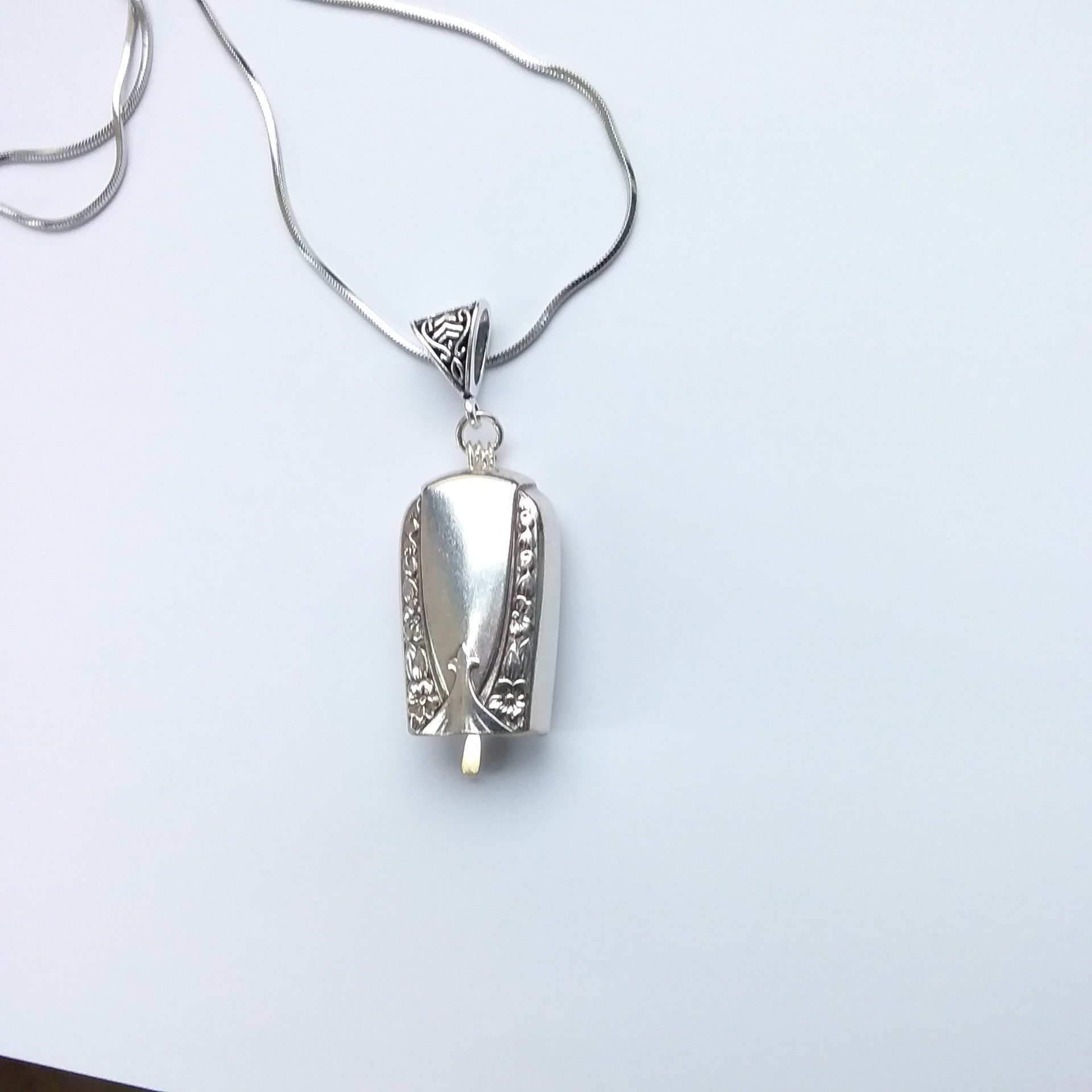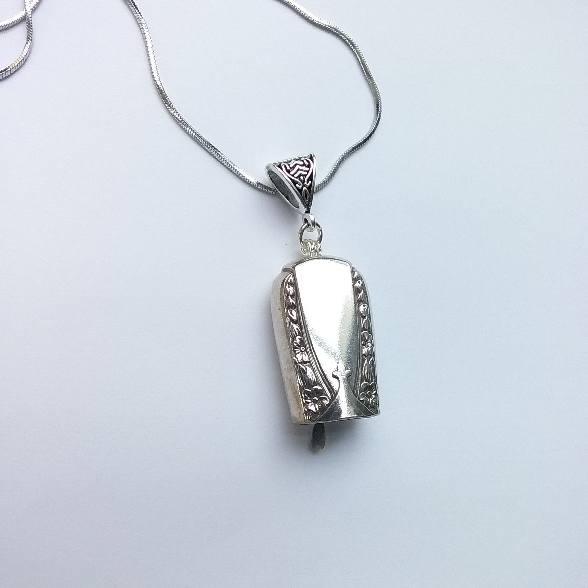 Talisman 1938 pattern recycled silverware. All components individually measured and cut to assure a pleasant ringing sound. Chain is 24" stainless steel. It can easily slide off chain and be worn on your own shorter chain or cotton cording. Very versatile.