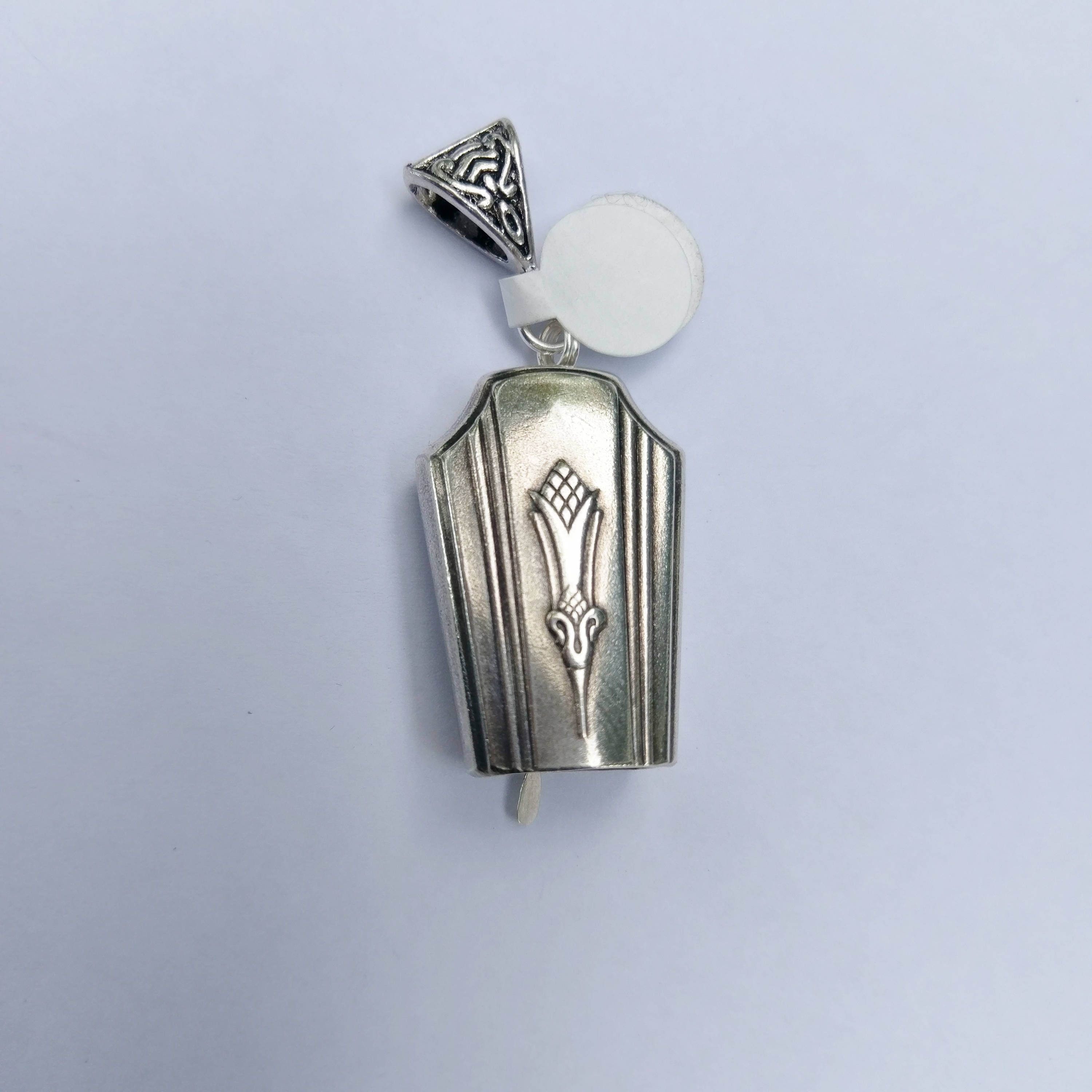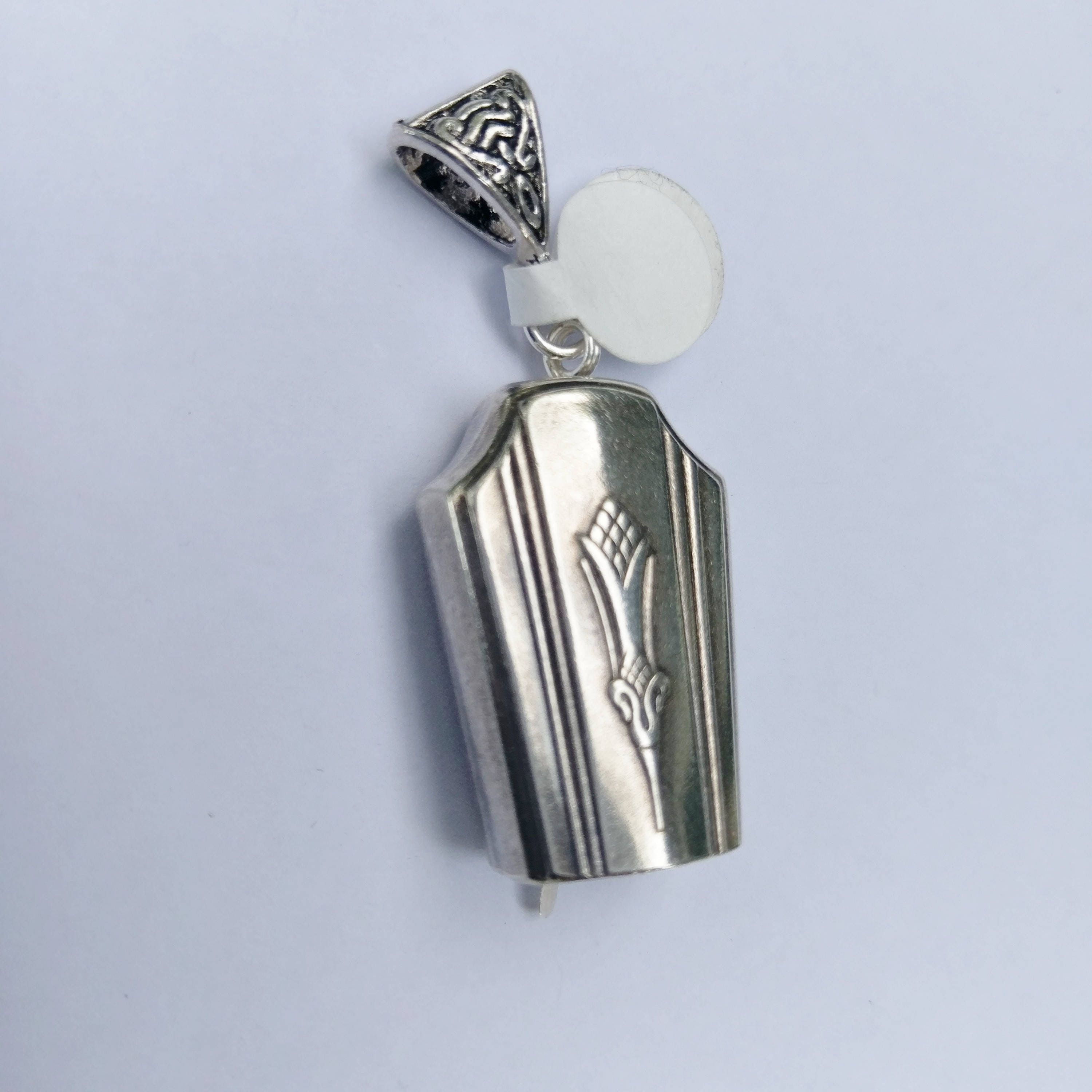 Casino 1931, recycled silverware. All components individually measured and cut to assure a pleasant ringing sound. Chain is 24" stainless steel. It can easily slide off chain and be worn on your own shorter chain or cotton cording. Very versatile.