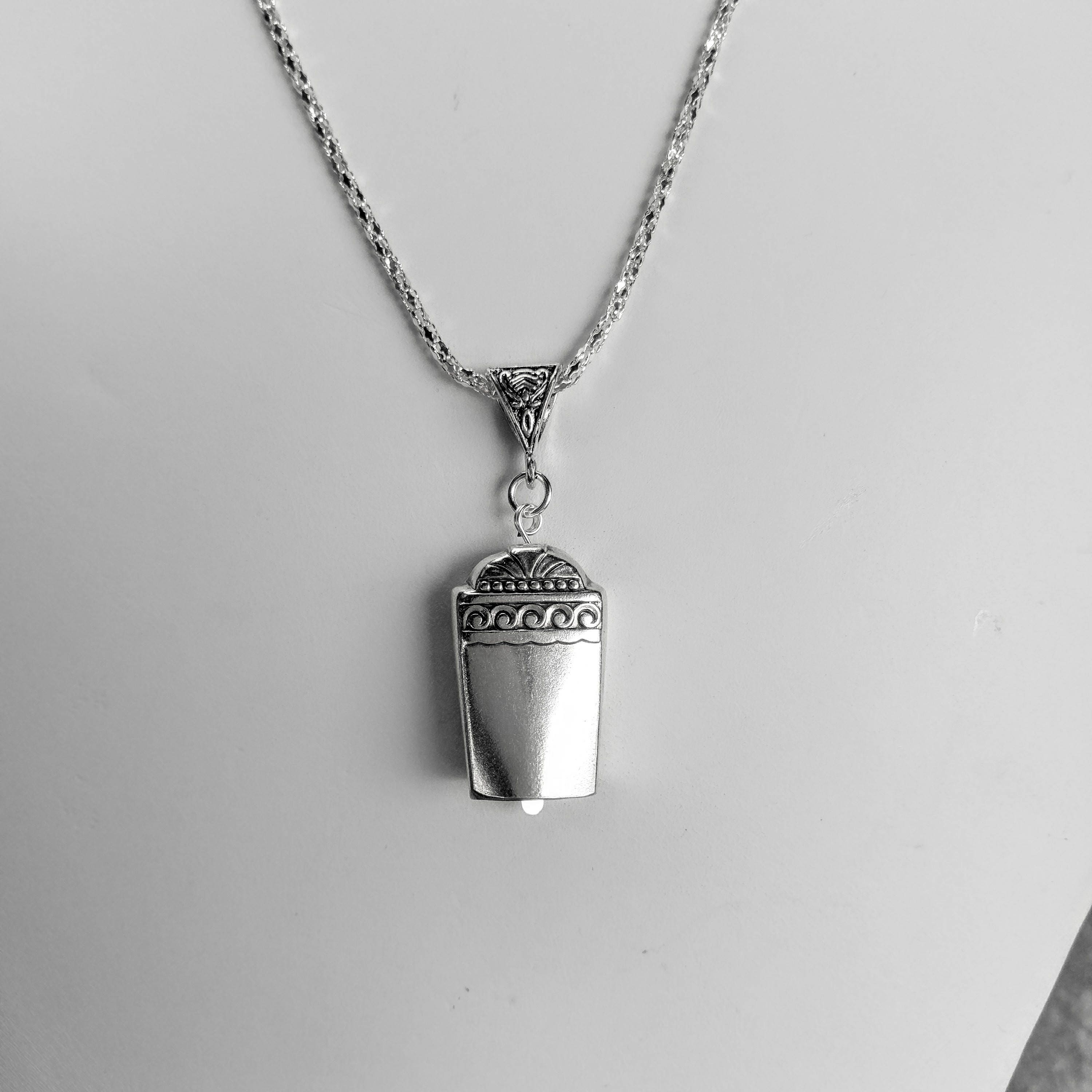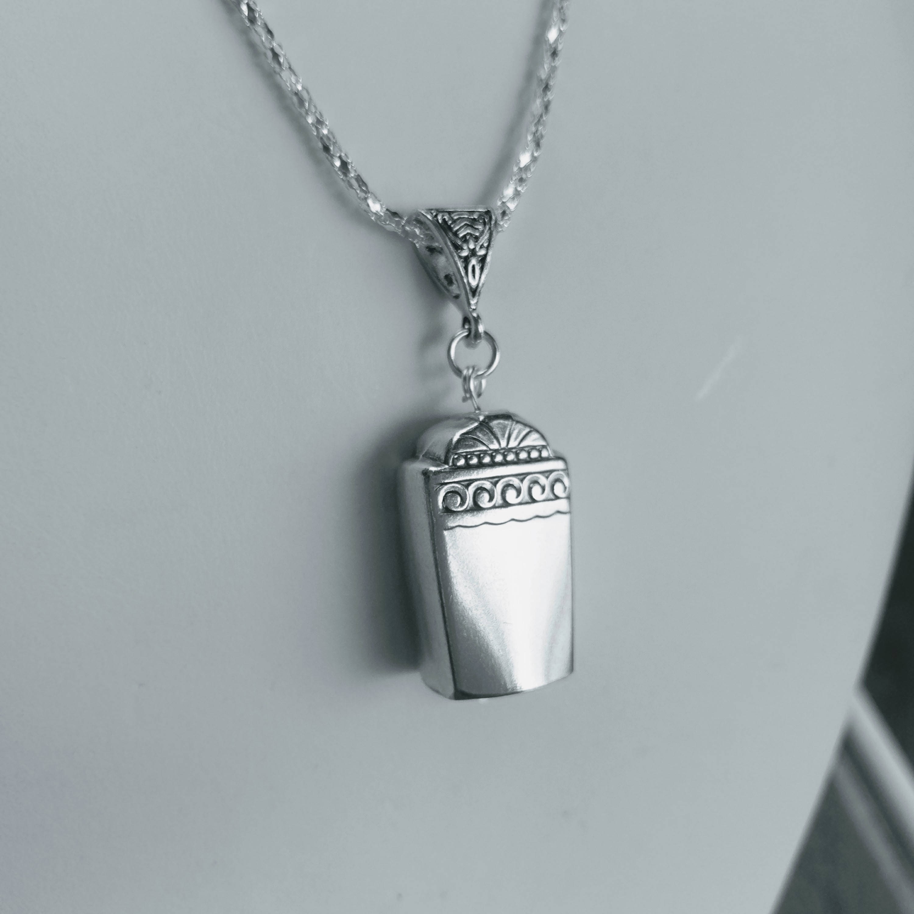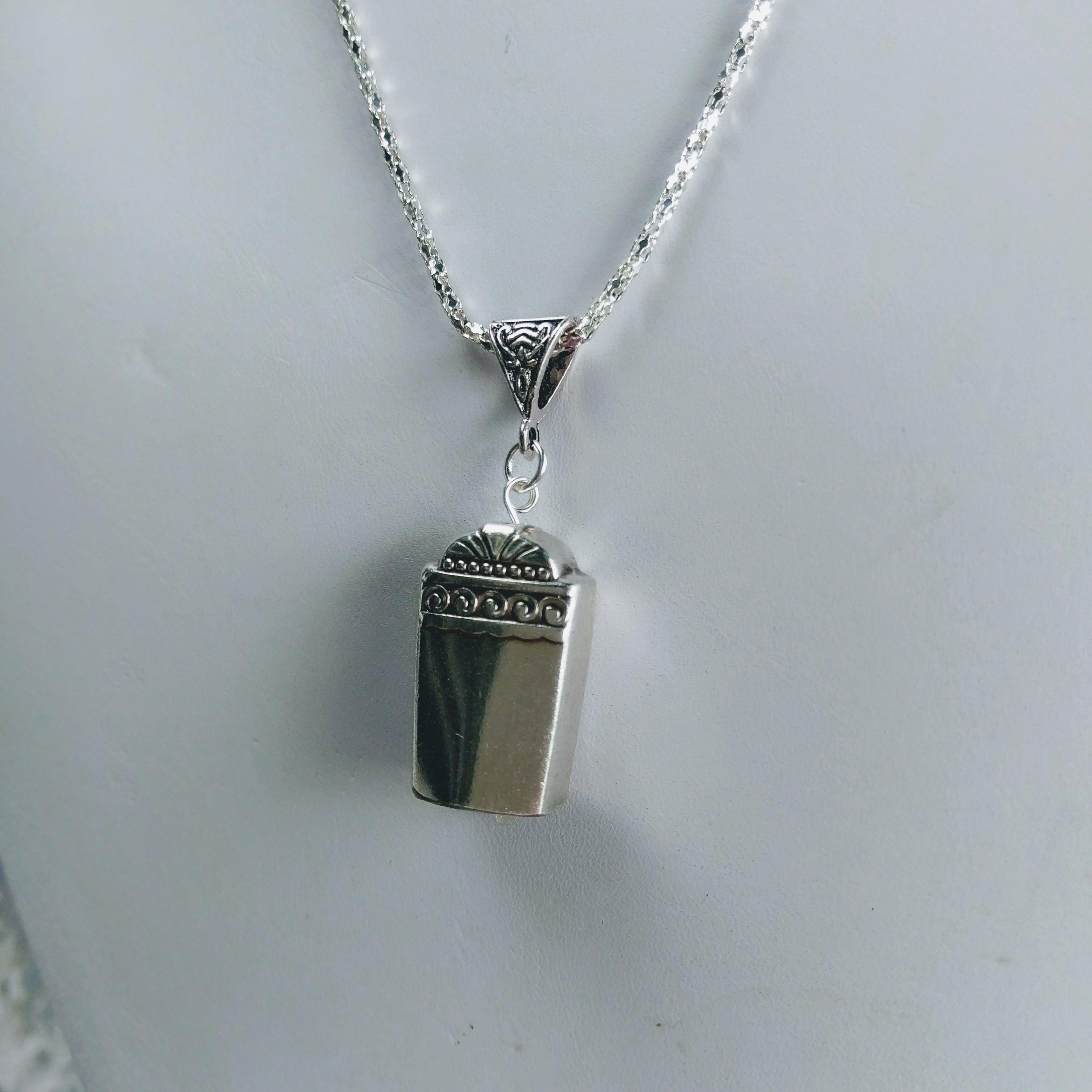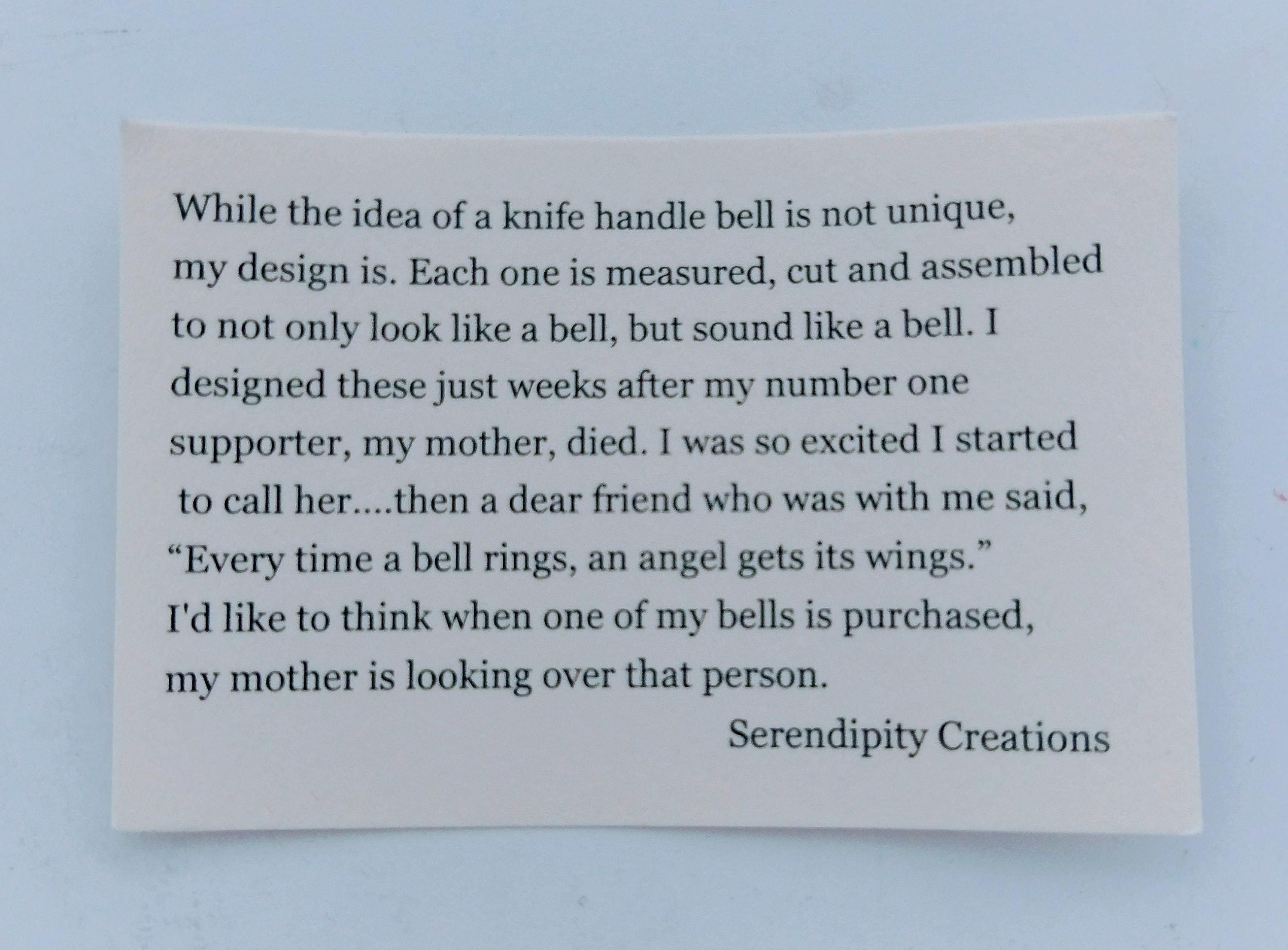 Unknown, recycled silverware. All components individually measured and cut to assure a pleasant ringing sound. Chain is 24" stainless steel. It can easily slide off chain and be worn on your own shorter chain or cotton cording. Very versatile.