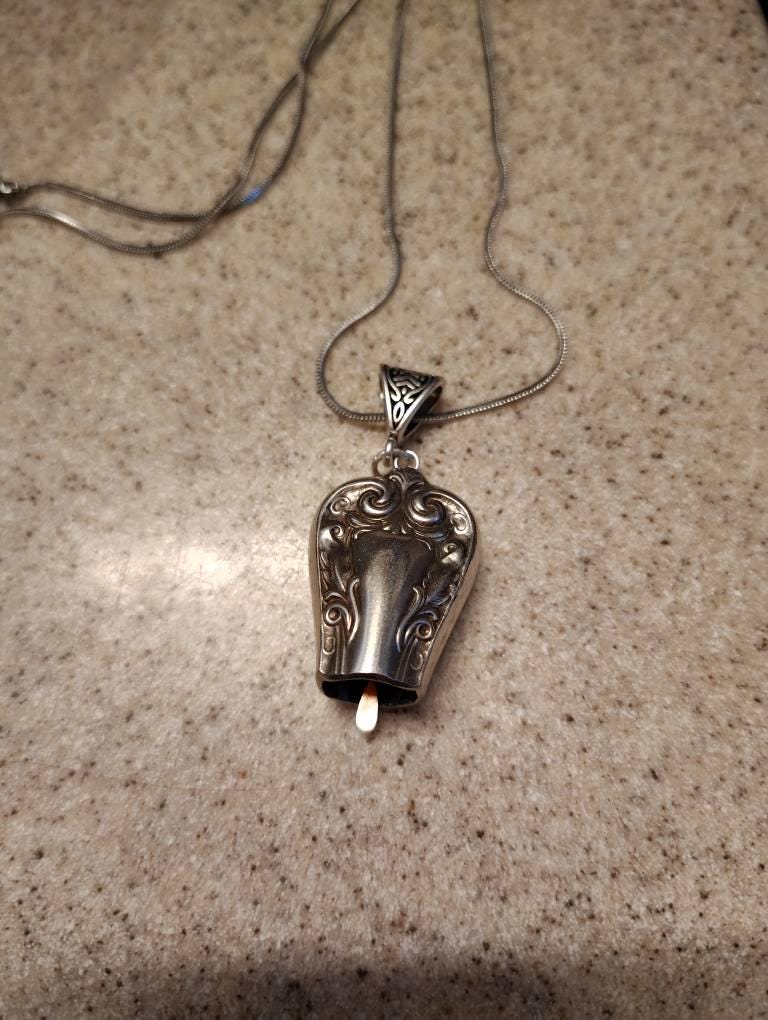 Recycled silverware. All components individually measured and cut to assure a pleasant ringing sound. Chain is 24" stainless steel. It can easily slide off chain and be worn on your own shorter chain or cotton cording. Very versatile.